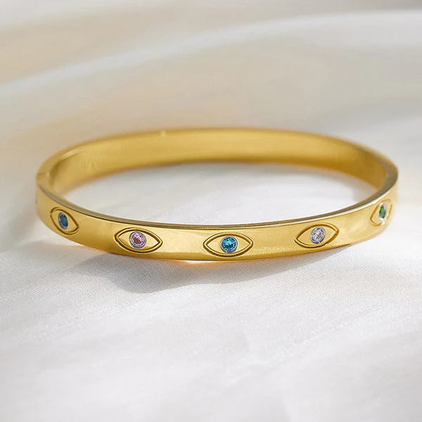 Stainless Steel Gold-Plated Multicolor American Diamond Evil Eye Bangle-Style Anti-Tarnish Bracelet For Women